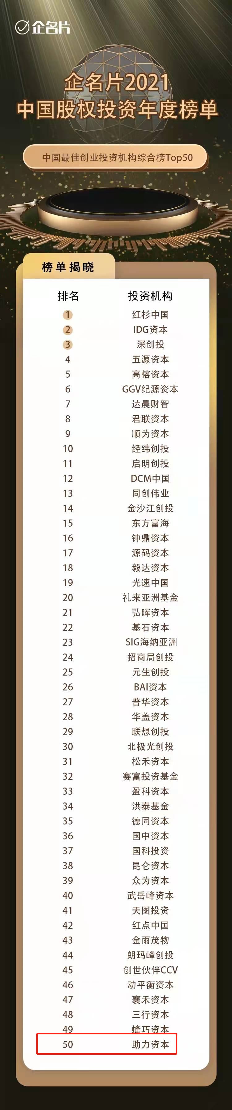 助力荣誉 | 助力资本荣登“企名片2021中国最佳创业投资机构综合榜Top50”榜单发表时间:2022-01-19 17:36 企名片创服团队自2018年起已连续4年发布中国股权投资年度排名,依托企名片强大的大数据优势,秉承着数据为准、公平公正的态度,通过调研问卷、集合走访和电话回访等多种方式,综合对结构各方面进行严格考核,最后评选出获得了投资机构以及财务顾问机构的一致肯定的榜单。